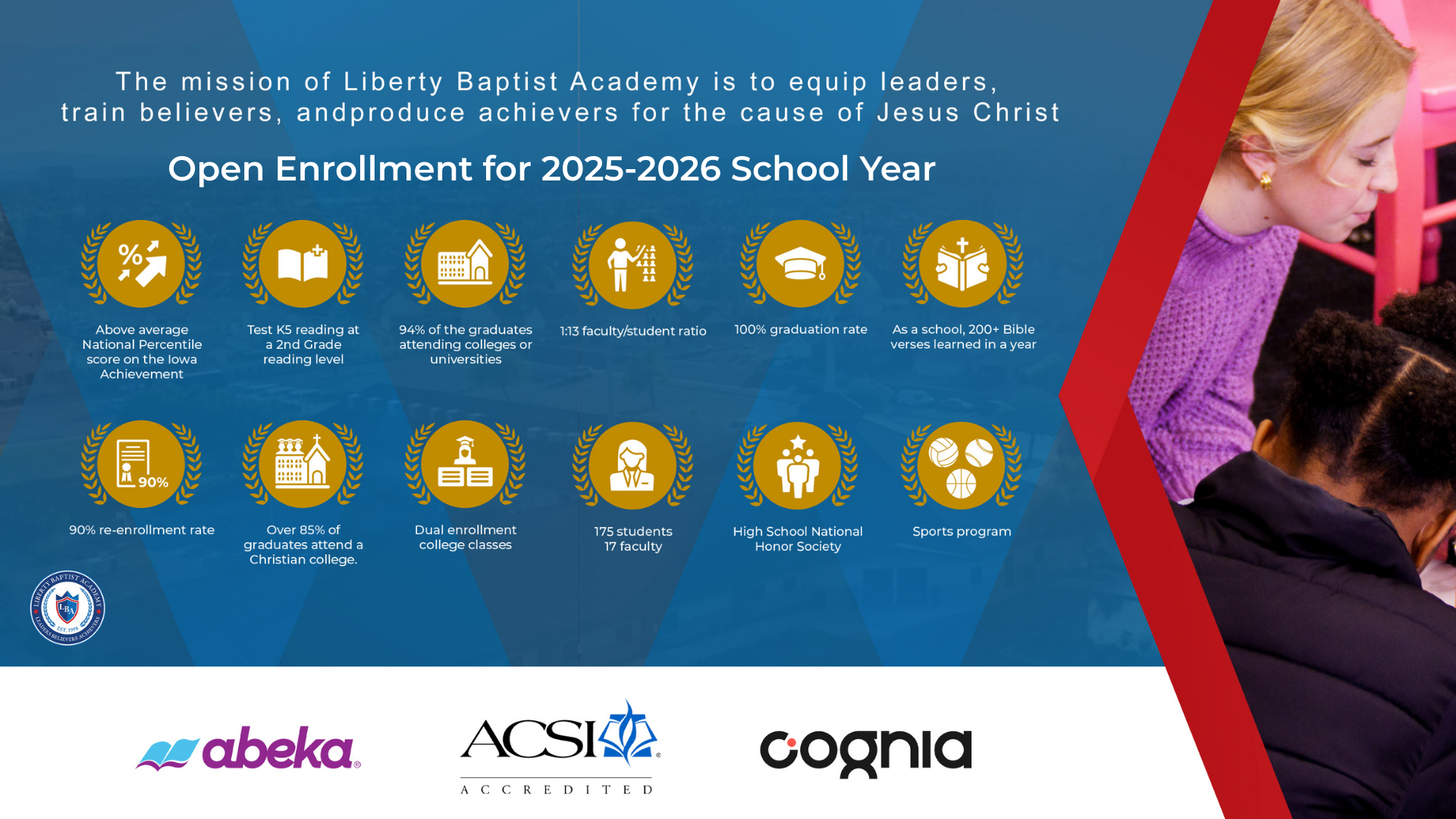 The mission of Liberty Baptist Academy is to equip leaders, train believers, and produce achievers for the cause of Jesus Christ.